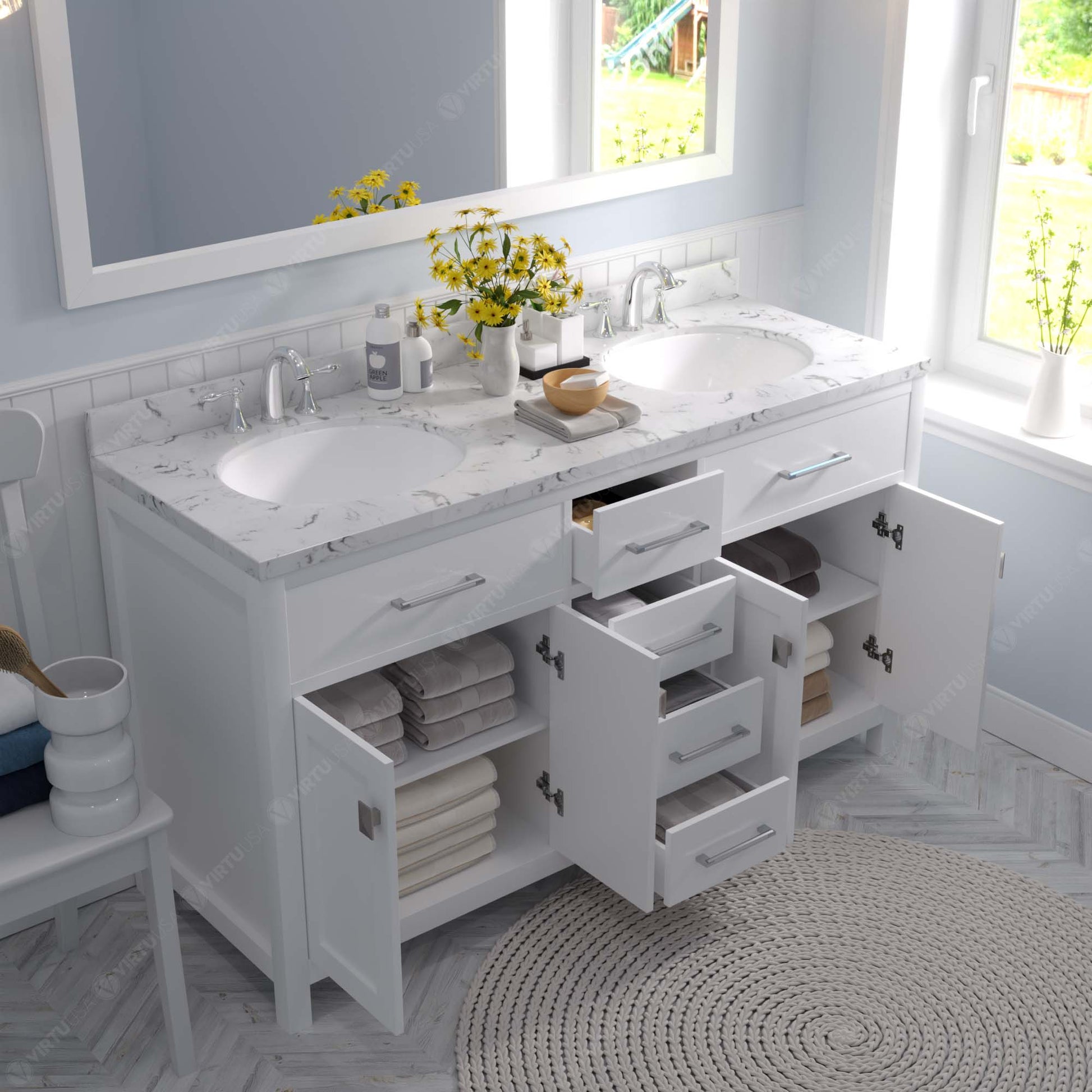 Caroline 60" Double Bath Vanity in White with Cultured Marble Quartz Top and Round Sinks