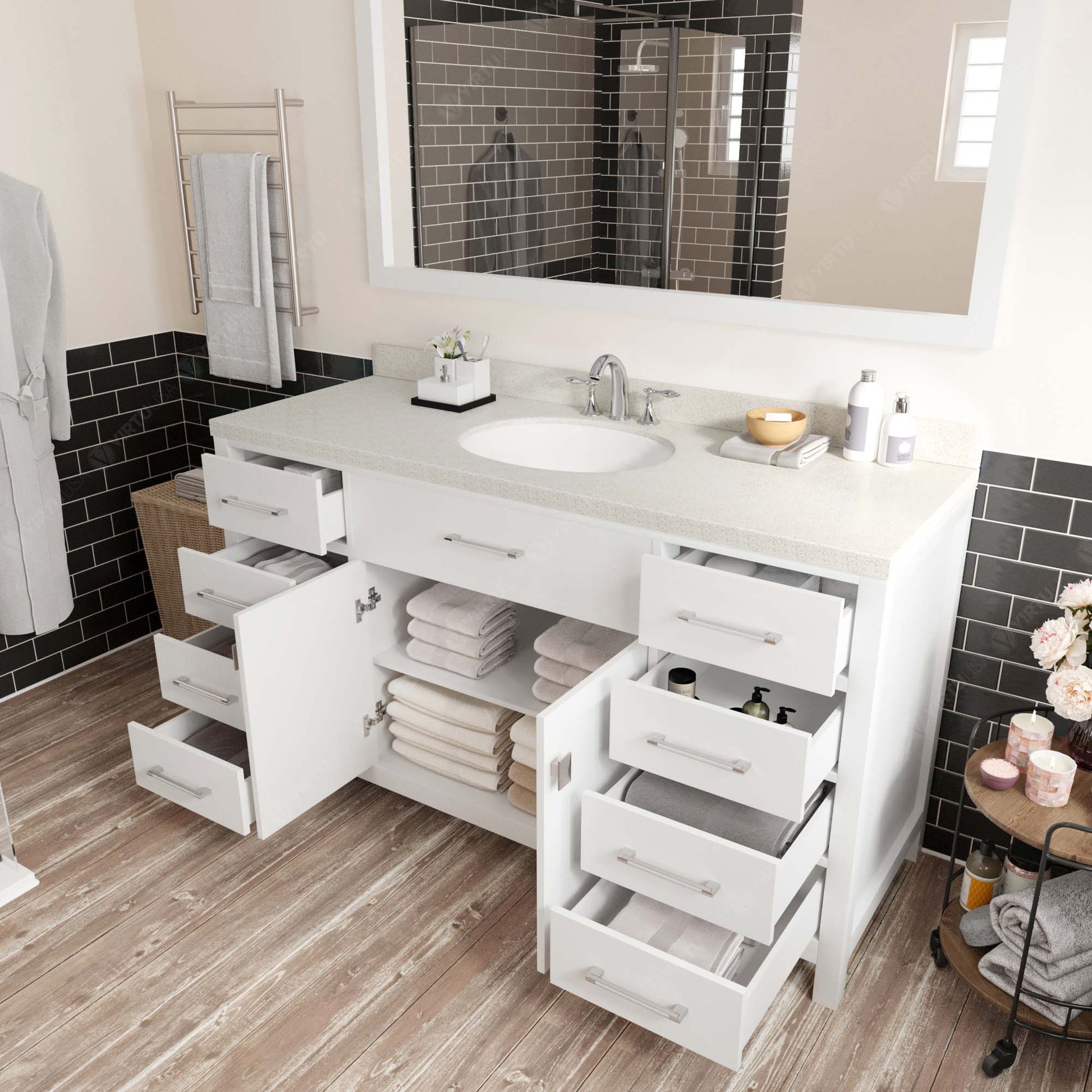 - Our flagship Caroline vanity collection emanates an understated elegance that brings beauty and grace to just about any living space.